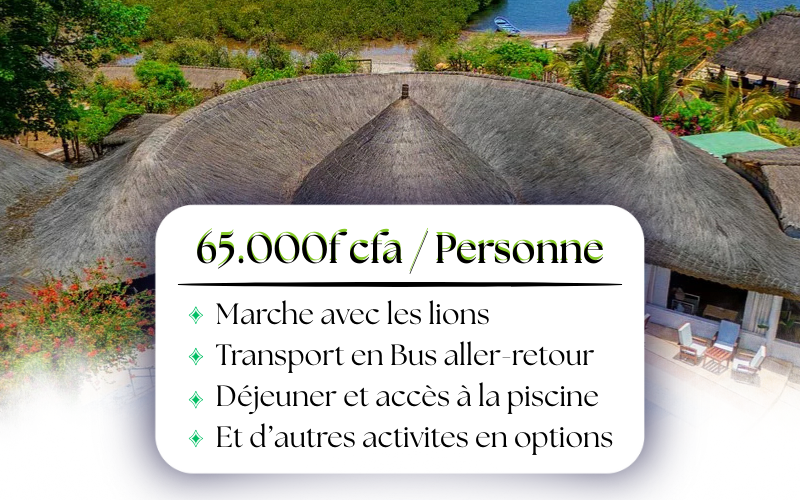 Partez pour une journée inoubliable dans les Îles du Saloum avec transport aller-retour inclus. Vivez une expérience unique avec la marche avec les lions, profitez d’un déjeuner savoureux et d’un accès à la piscine dans un cadre naturel et paisible. En option, explorez les merveilles du Saloum avec une balade en pirogue dans les mangroves et la visite d’autres sites emblématiques.